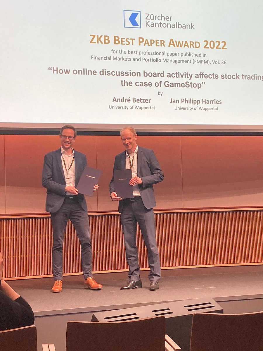 Dr. Jan Philipp Harries und Professor André Betzer, Lehrbereich Controlling sowie Finanzwirtschaft und Corporate Governance, erhielten auf der Jahrestagung der Schweizer Gesellschaft für Finanzwirtschaft, die am 31. März in Zürich stattfand, den „Best Paper Award“ für ihren wissenschaftlichen Artikel „How online discussion board activity affects stock trading: the case of GameStop“, in welchem sie am Beispiel des US-Unternehmens "GameStop“ empirisch einen Zusammenhang zwischen Social-Media Postings und Handelsvolumen der Aktie nachweisen.